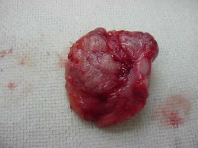 左の写真は鼠径部(股の部分)が腫れて、膿が出ているという事で来院されたポメラニアンから摘出した肉芽腫です。しこりができている場所、そして過去に近くの獣医さんで去勢をしているという事から、この「縫合糸反応性肉芽腫」を疑いました。細胞診で細菌がいない無菌の膿汁と言うことを確認後、手術で摘出しました。