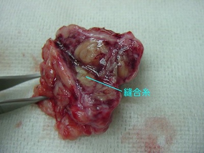 右の写真は摘出した肉芽腫を半分に切ったものです。少しわかりづらいですが、矢印の部分に縫合糸がありました。病理検査の結果、縫合糸に対する異物反応性肉芽腫、つまり「縫合糸反応性肉芽腫」でした。